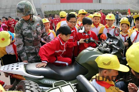 濟(jì)南小學(xué)生在軍營里現(xiàn)場親身體驗(yàn)武器裝備。(東方IC版權(quán)圖片)